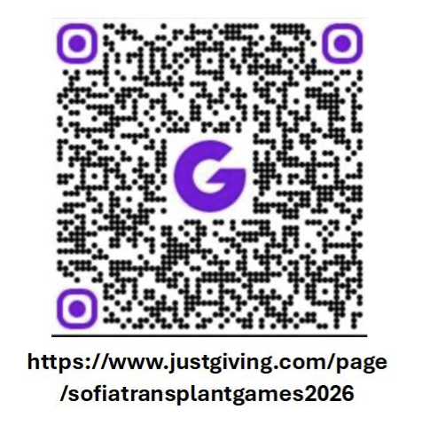 You can support Sofia’s journey to the 2026 British Transplant Games by scanning the QR code or donating directly through JustGiving.