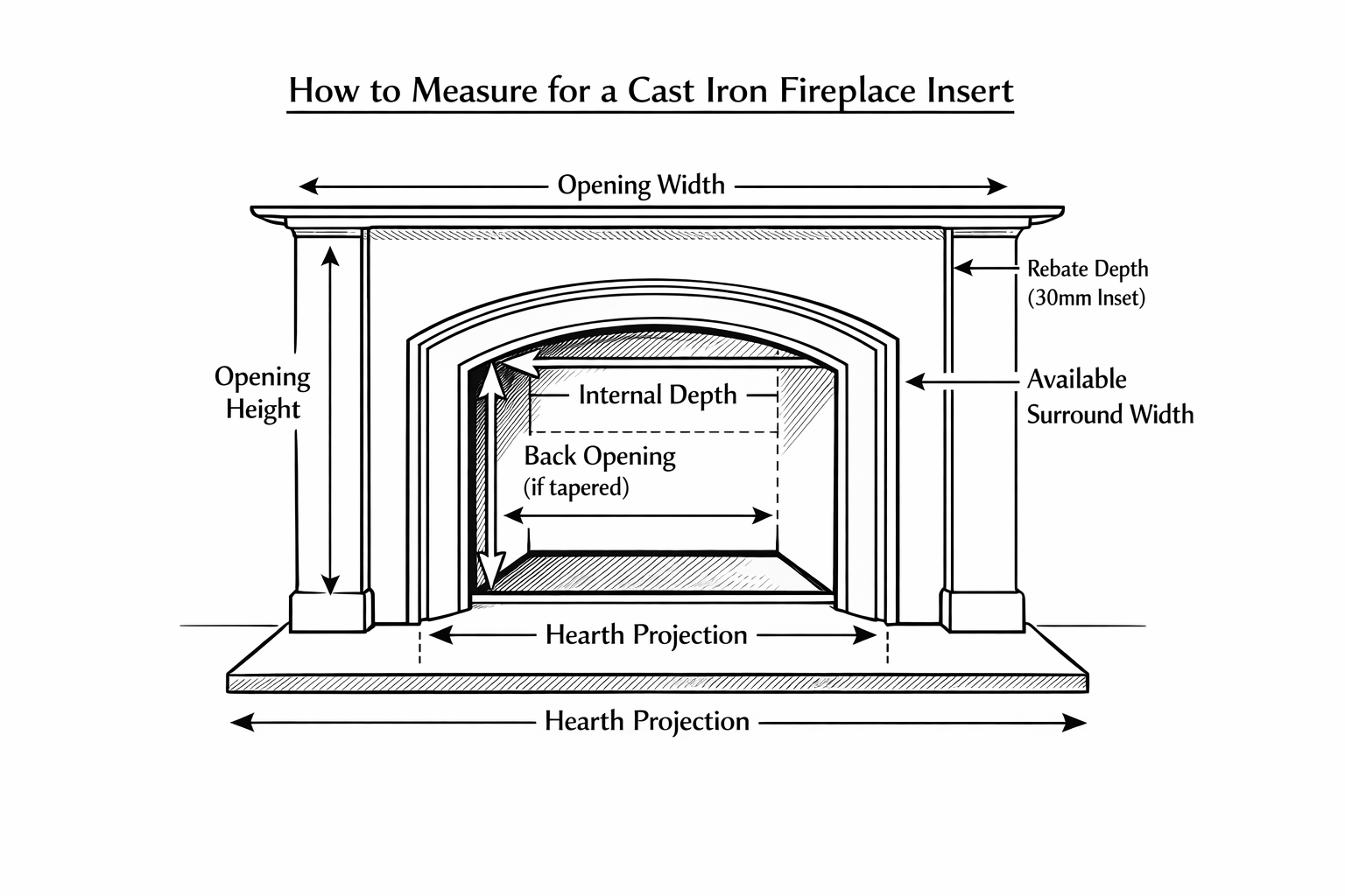 A cast iron fireplace insert is the main inner section of a fireplace that fits inside a surround, chimney breast opening or mantel arrangement.