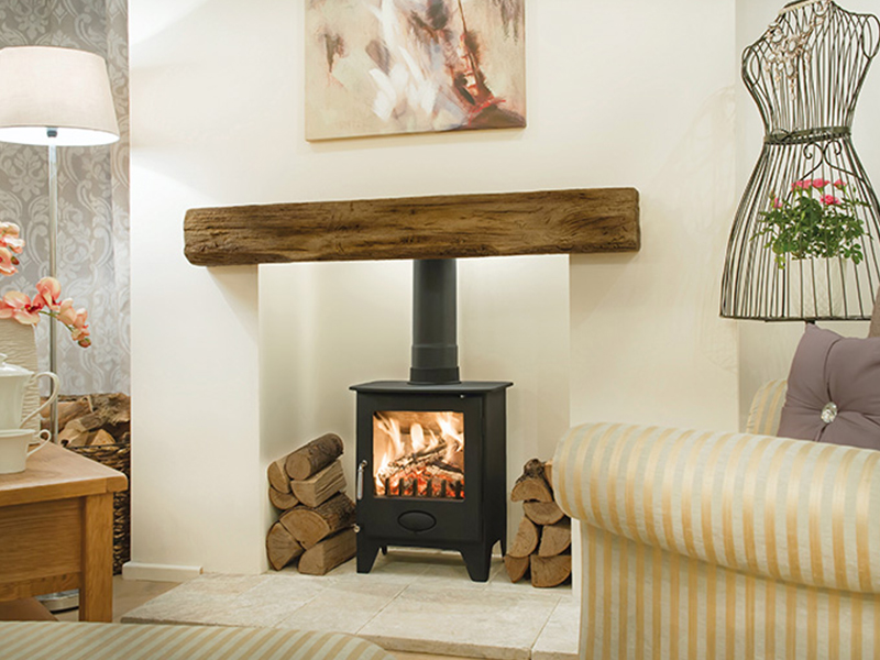If a wooden beam is too close, the installation may need to be changed. Common solutions include moving the beam higher, choosing a stove with lower tested clearances, using approved shielding where suitable, or replacing the timber beam with a non-combustible fireplace beam.