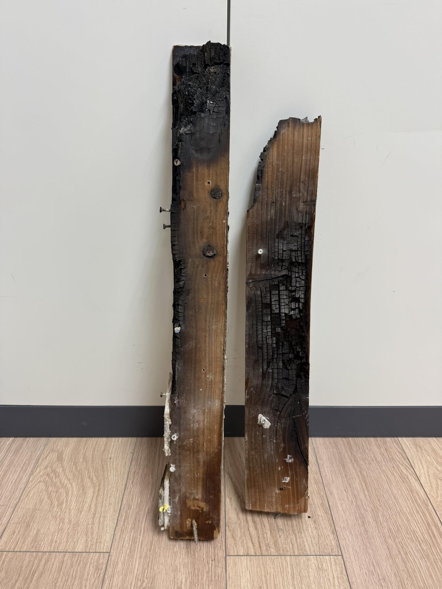 Heat-damaged charred wood removed from a stove installation due to poor clearance to combustible materials.