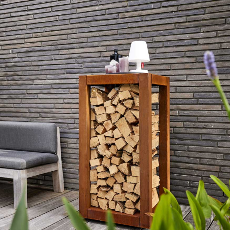 The RB73 Quarubox is a sleek, mobile, and durable Corten steel wood storage unit designed for outdoor use.