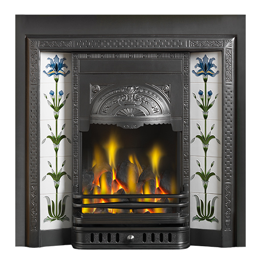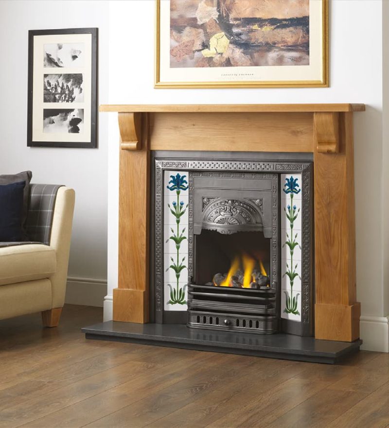 Accompanied by the Brampton mantelpiece fashioned from solid oak (with a light oak finish), the Aston is exhibited alongside a Flag Iris tile set, hand-painted in shades of blue and ivory, and paired with a honed black granite hearth.
