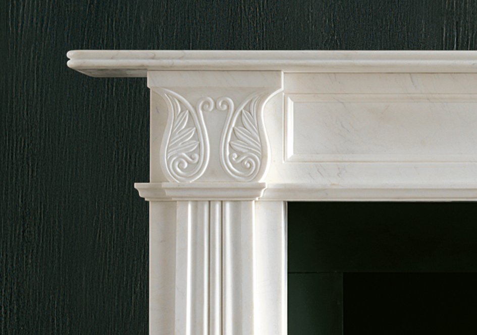 Chesneys’ fireplace surround is a perennially popular design, meticulously carved in statuary marble with elongated tapering jambs, acanthus corner blocks, and a fielded frieze panel.
