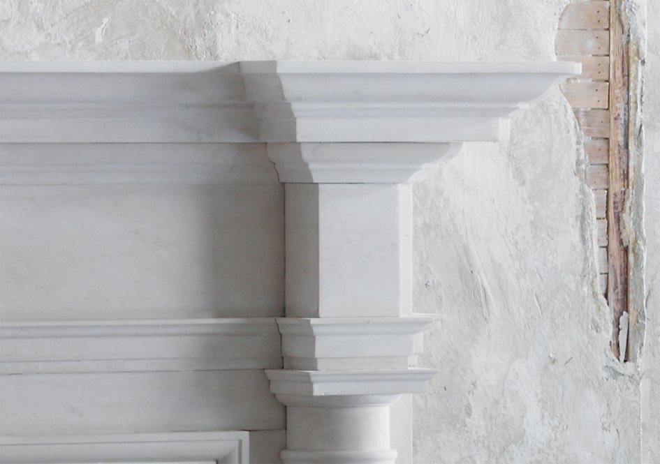 The Chambers by Chesneys is an elegant limestone fireplace surround that channels the grandeur of Georgian design with its engaged columns, Doric capitals, and a distinguished breakfront corniced shelf.