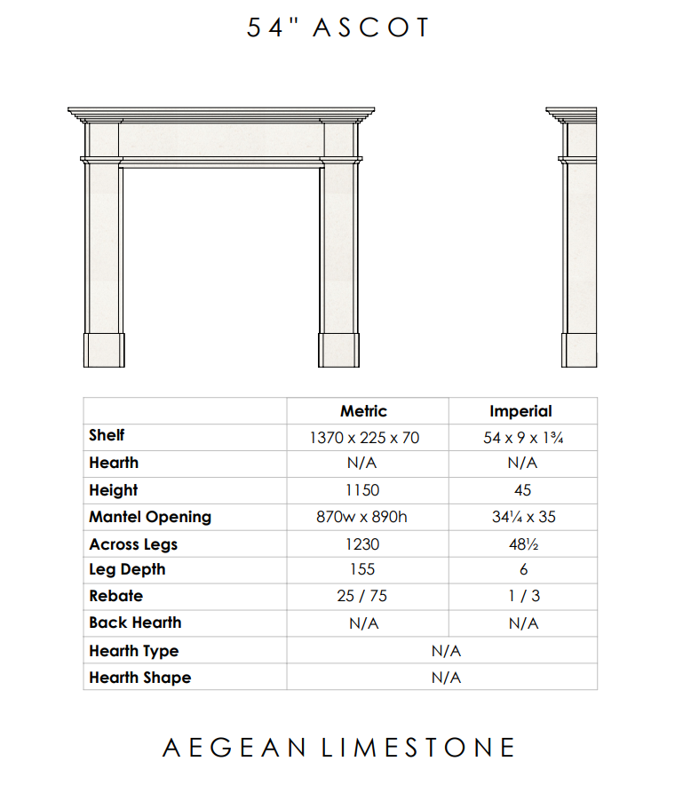The Ascot Fireplace Surround, crafted from exquisite Aegean limestone, offers a timeless and sophisticated touch to any home. Available in 54″ with two rebate options (25mm and 75mm), this versatile surround allows for personalized customization.