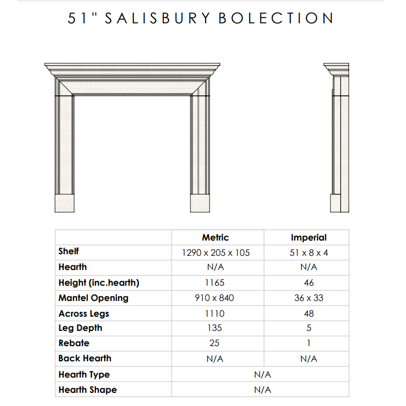 Designed for flexibility, the Salisbury 51″ surround is compatible with gas, electric, and inset fires. Its compact proportions, timeless design, and premium material make it a perfect choice for homeowners seeking a high-quality fireplace that enhances smaller rooms.