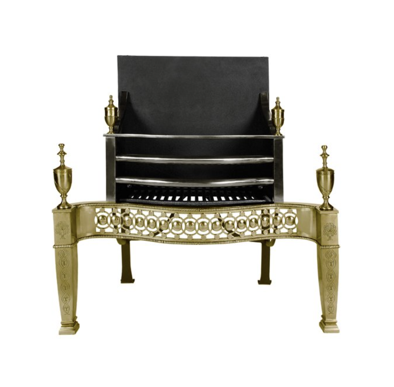 The fire basket features a finely worked serpentine fret, showcasing intricate detailing that reflects the skill and dedication of its makers. The hand-engraved columns add an extra layer of sophistication, while the classical finials, crafted in the form of urns, serve as a nod to the period’s architectural influences. Each element of this fire basket has been meticulously designed and handcrafted, ensuring that it stands out as a true work of art.