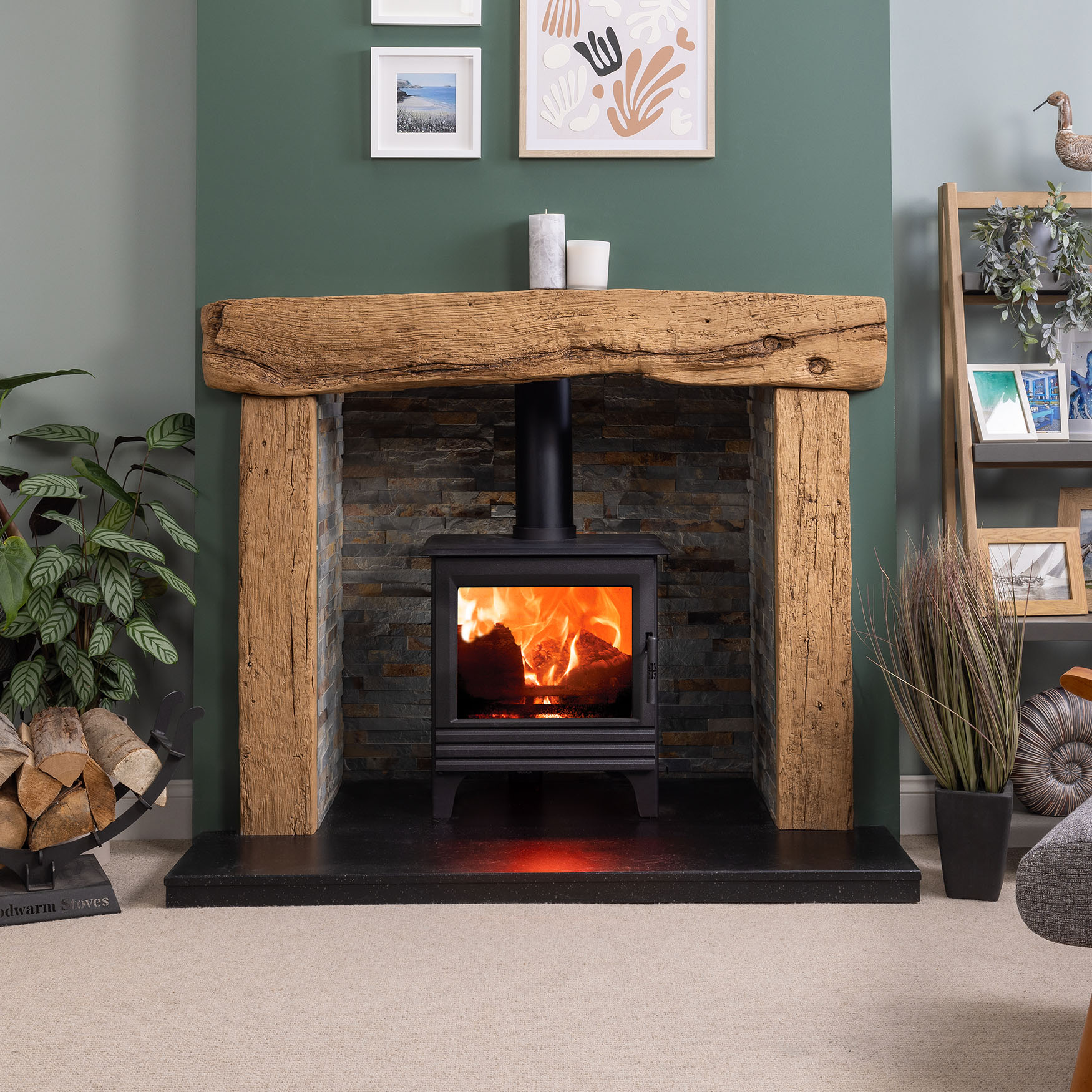 The Jorvic Non-Combustible Fireplace Surround features a beautifully detailed fascia beam made from an authentic historic rafter, adding unique character to any space.