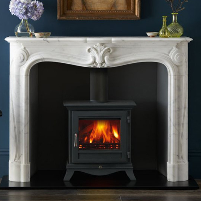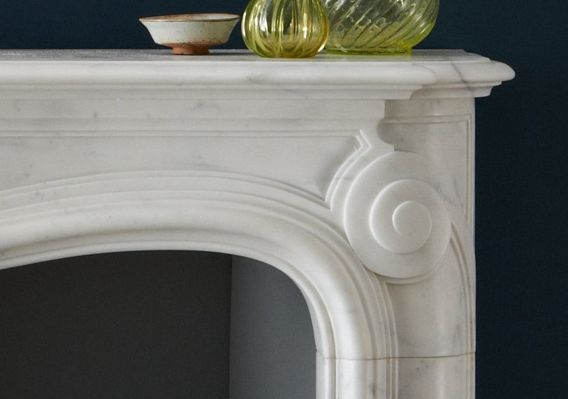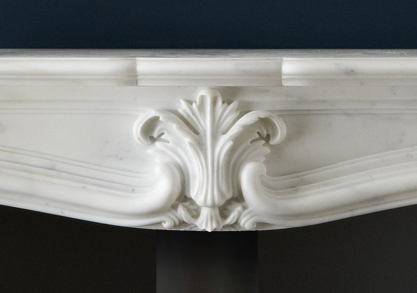 La Rochelle is a French-inspired chimneypiece featuring elegant carved detailing and a flowing serpentine shelf.