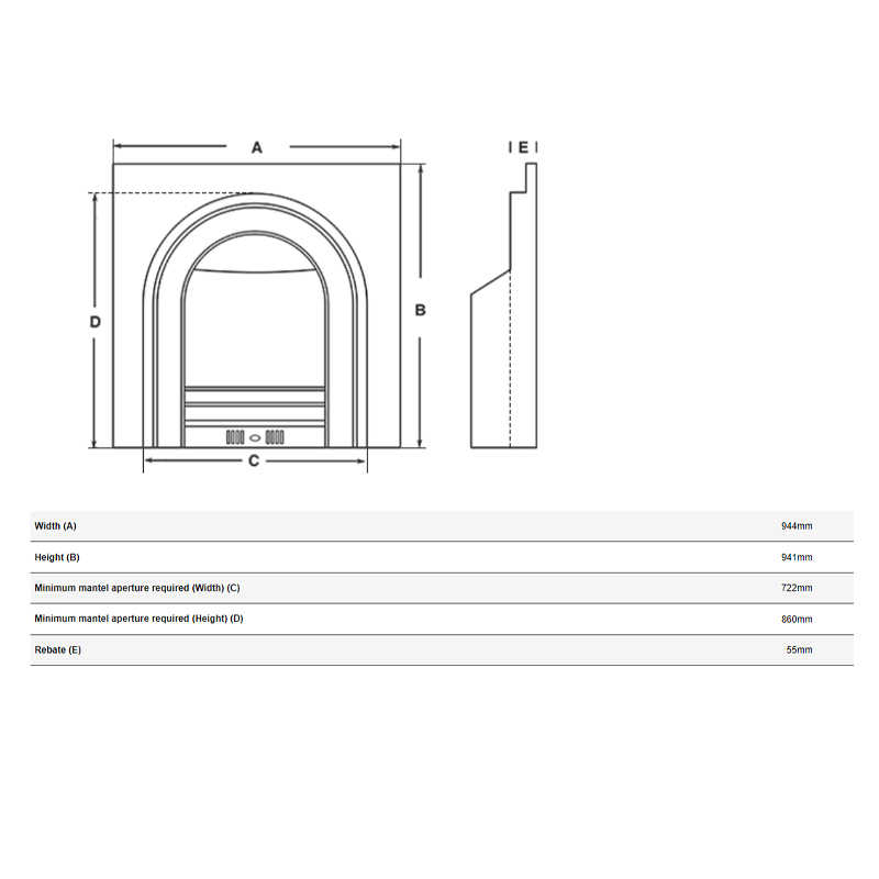 - 55mm rebate – allows smooth integration with standard mantels and surrounds.