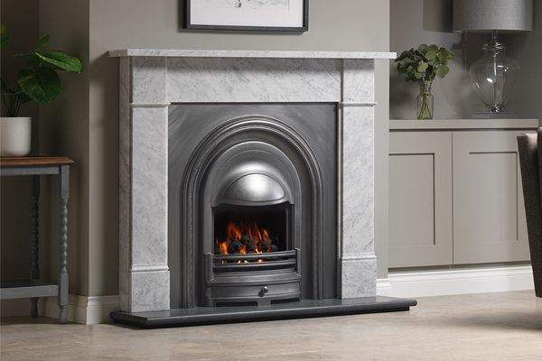 The Royal’s antique finish pairs perfectly with a honed black granite hearth, enhancing its depth and sophistication. When combined with lighter mantels—such as the Flat Victorian surround in Italian Carrara marble—it achieves a stunning visual contrast that elevates any interior. Its clean, minimalist arch ensures versatility, allowing it to adapt effortlessly to a range of décor styles while maintaining a classic cast-iron presence.