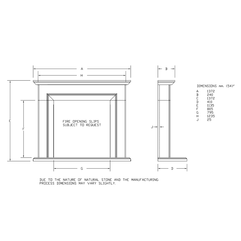 - Honed or polished black granite hearth and slips subject to request.