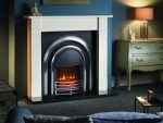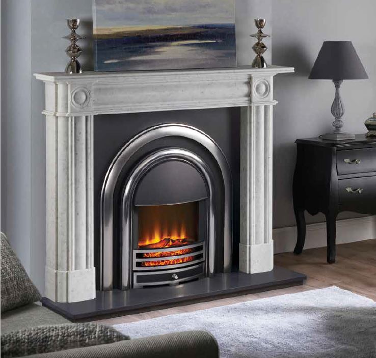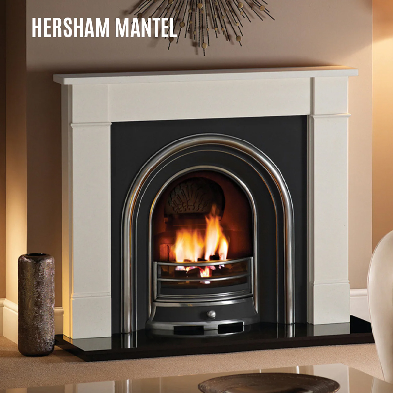 The suite features a handcrafted Aegean limestone mantel in a traditional Victorian arch design, offering a refined and timeless aesthetic. The integrated back panel and fireframe, available in Black or Highlighted finishes, create a cohesive and elegant fireplace structure that complements the surround.