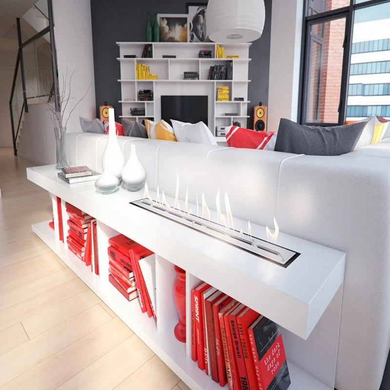 The Built-In Bioethanol Burner without Lip – 525mm is a compact drop-down burner designed for minimalist indoor installations where clean lines and subtle flame presence are essential. With no visible edge or frame, it integrates seamlessly into furniture, shelves, or architectural recesses.