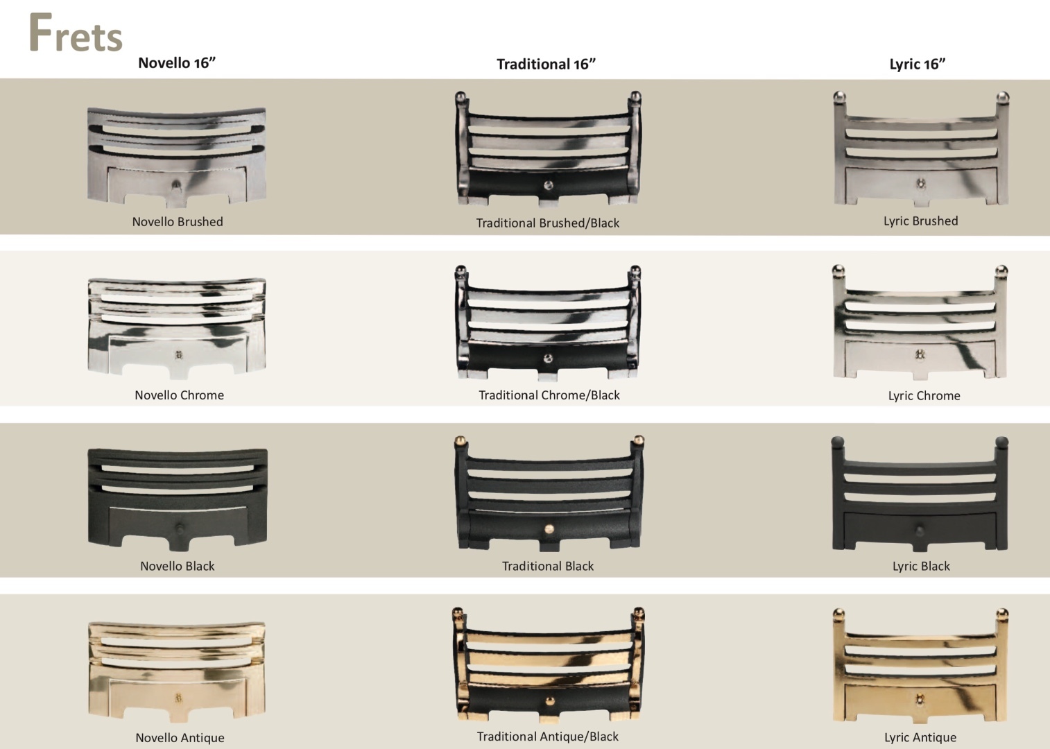 • Option of brass, black and chrome frame with traditional and Lyric front.