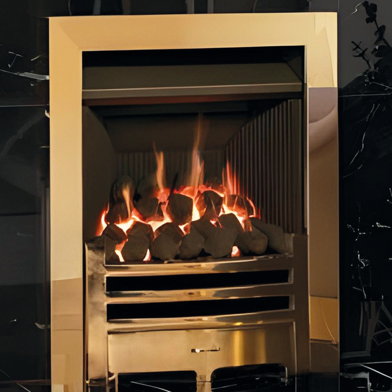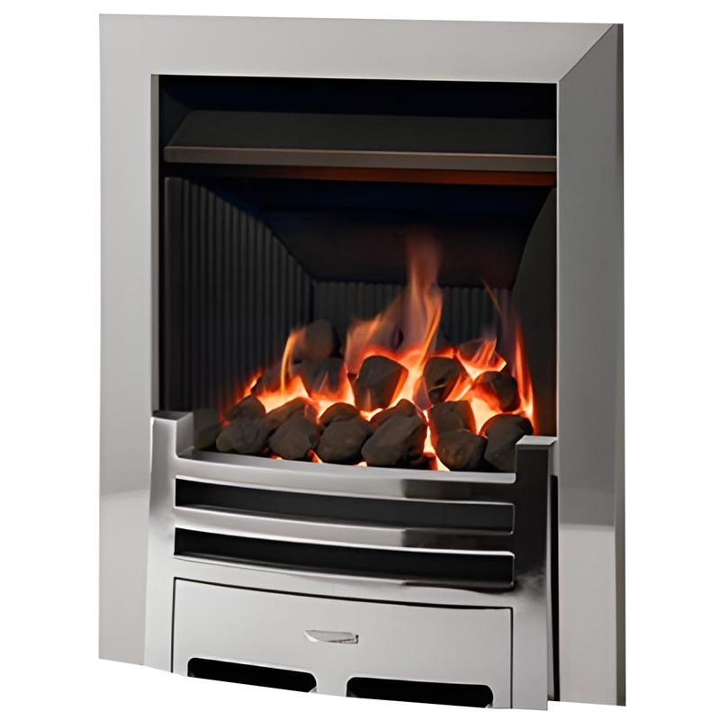 The fire features a realistic coal-effect fuel bed, replicating the appearance of a traditional solid fuel fire while offering the convenience and control of gas. The open-fronted design enhances the flame picture, creating a natural focal point within the room.