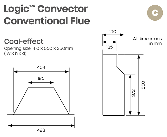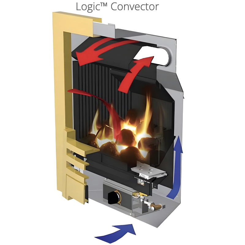 Designed for installation into a standard fireplace opening, the Logic Convector Arts is compatible with both Class 1 and Class 2 flues, provided there is adequate recess depth. It is available in both Natural Gas and LPG versions, allowing flexibility depending on your setup. With a heat input of 6.7 kW, additional room ventilation is not normally required in most installations.