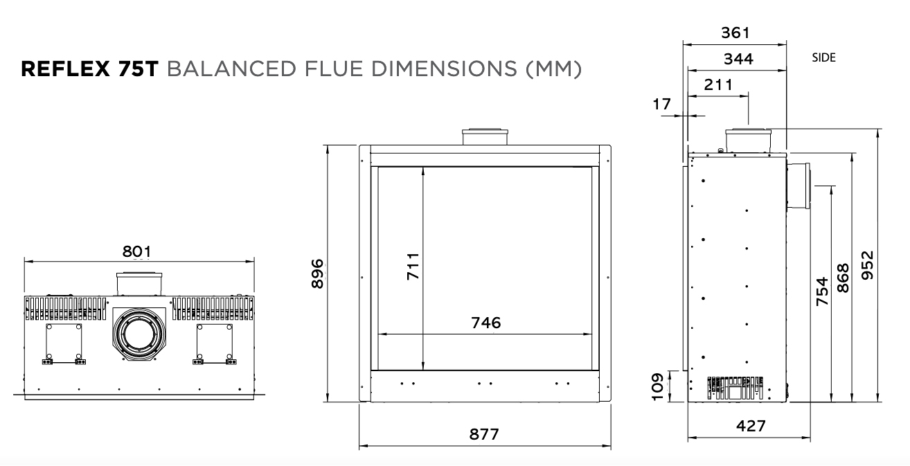 With a maximum heat output of up to 10.0 kW and an efficiency of 92%, the Reflex 75T is suited to larger living spaces, providing strong and consistent warmth. The balanced flue system allows installation against an external wall or through the roof, using a sealed twin-wall pipe that draws air from outside and expels combustion gases externally. This ensures efficient operation without affecting indoor air quality, making it ideal for modern, airtight homes.