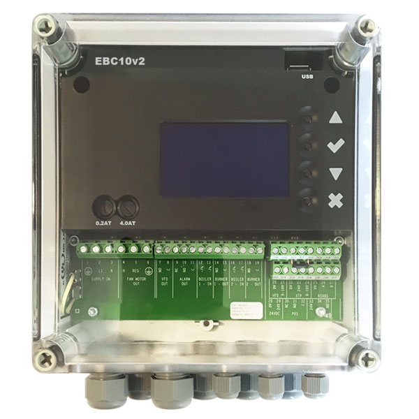 The EBC10v2 is a control unit for maintaining constant chimney pressure in single boiler setups using an XTP sensor.