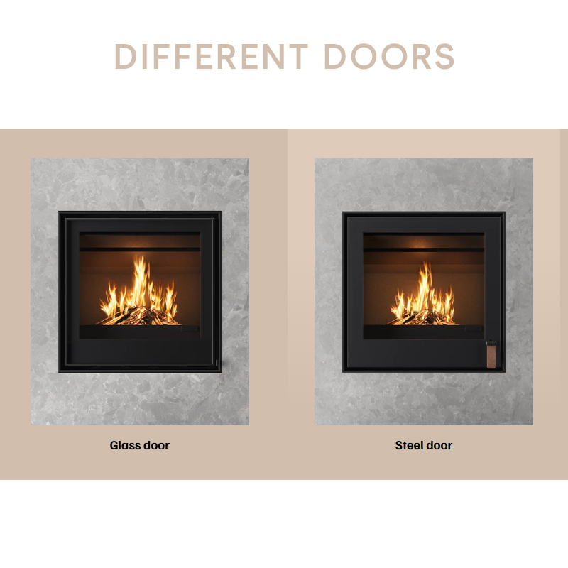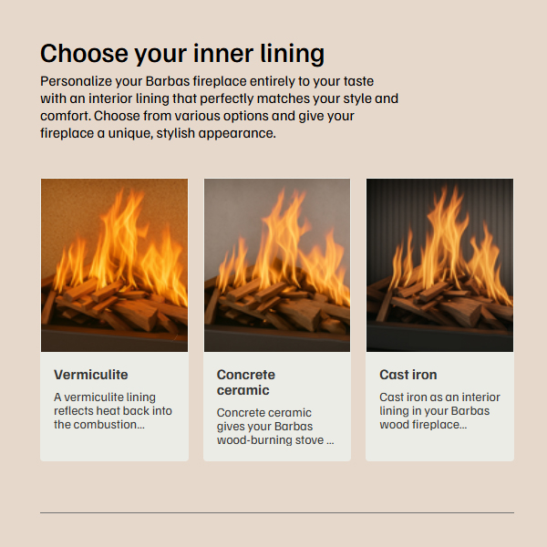 To match your personal style, Barbas offers a wide range of customisation options. Choose from different frames, door designs, handles, and interior linings to create a fireplace that fits your home perfectly. Add practical upgrades like an Airbox for external air supply or a convection fan for faster heat distribution, and enjoy the comfort of a fireplace tailored exactly to your needs.
