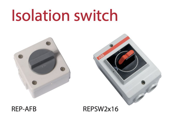 The REP-AFB is a 2-pole isolation switch compatible with controls such as EFC16, EFC35, EW41 (included with a repair switch), EBC10v2, and EBC24. In contrast, the REPSW2x16 is a 4-pole isolation switch (or 3-pole with a help switch) designed for use with the EFC18 control system.