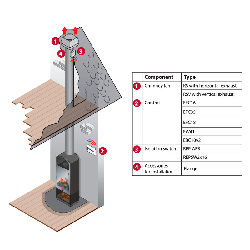 All models require a REP-AFB isolation switch to be mounted on the chimney, which must be installed by an authorized electrician.