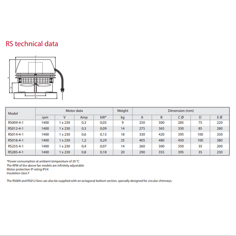 Exodraft RS chimney fans are designed so that they are suitable for continuous use at temperatures up to 250°C. The chimney fan is made of cast aluminium; all screws and bolts are made of stainless steel.