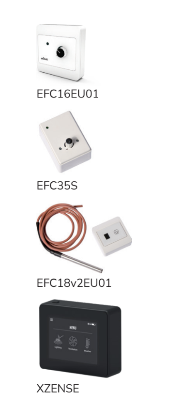 The EFC18 is a manual nine-step speed regulator with an integrated automatic START/STOP function and a boost mode to simplify lighting the fire; it also includes a temperature sensor for installation under the fan.