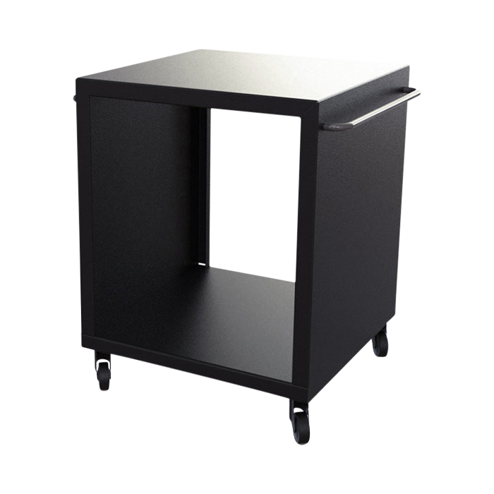 Featuring small, sturdy wheels, the table can be effortlessly moved with a gentle pull on the side-mounted stainless steel handles. These handles also serve as discreet and practical hangers for various grilling utensils. Crafted from powder-coated, galvanized steel sheet, the cabinet’s slightly coarse texture complements the renowned cast iron surface.