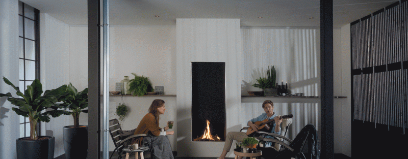 Finished in black steel as standard, the Sky Large Front Outdoor can be enhanced with optional black reflective panels to add depth and visual impact to the flames. Control is simple with the standard remote, while optional upgrades include app control via Wi-Fi, home automation integration, wall switch operation and the Powerfan system, offering maximum flexibility in installation.