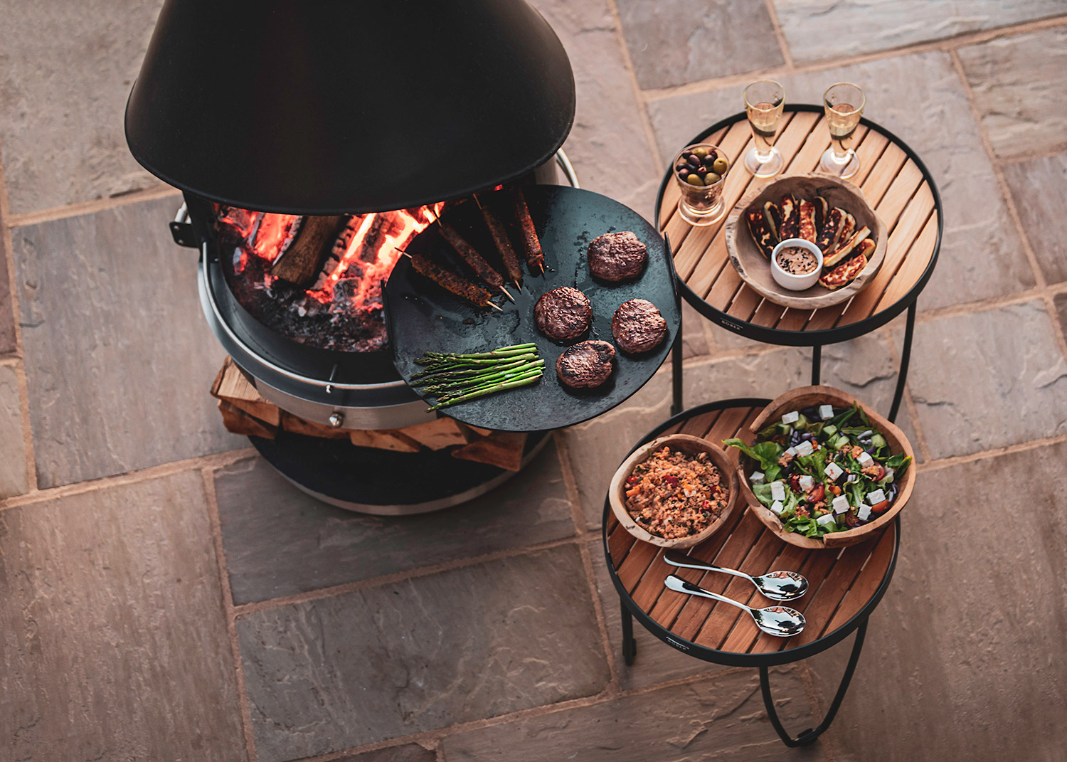 Built entirely from robust stainless steel up to 3 mm thick, the fireplace is corrosion-resistant and suitable for year-round outdoor use without a cover. Three smooth-running stainless steel castors provide full mobility, allowing easy repositioning or simple adjustment to changing wind direction.
