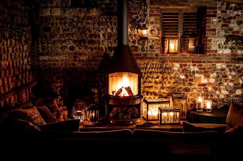 A thick lining of vermiculite fire bricks captures heat from burning wood and projects it forward—reaching up to 5 m—making it effective on cool spring or autumn days as well as long summer nights.