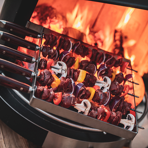For cooking, an optional stainless steel grill attaches effortlessly at four different height settings. Additional accessories—designed to mount in the same way—offer further flexibility for outdoor food preparation.
