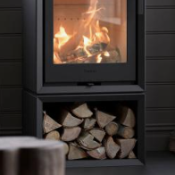 The optional matching log box enhances both function and design, raising the stove to a more ergonomic height while providing practical log storage beneath. This not only improves usability but also creates a more complete, furniture-style installation.