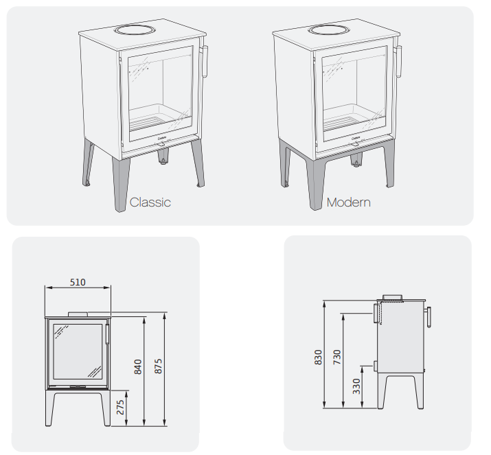 The Classic base, with its angled legs, offers a timeless appeal, while the Modern base provides a more streamlined, straight-legged appearance. For added functionality, the wood compartment option combines practical storage with chic style, allowing you to keep firewood conveniently close by without compromising the room’s aesthetic.