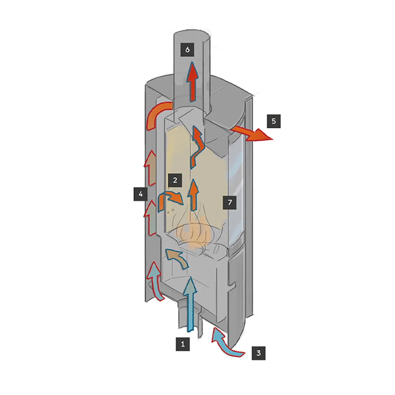 As the stove burns, convection air moves around the chamber to capture heat from the smoke, naturally releasing warm air into the room while an airwash system helps keep the glass clear for a better view of the flames.
