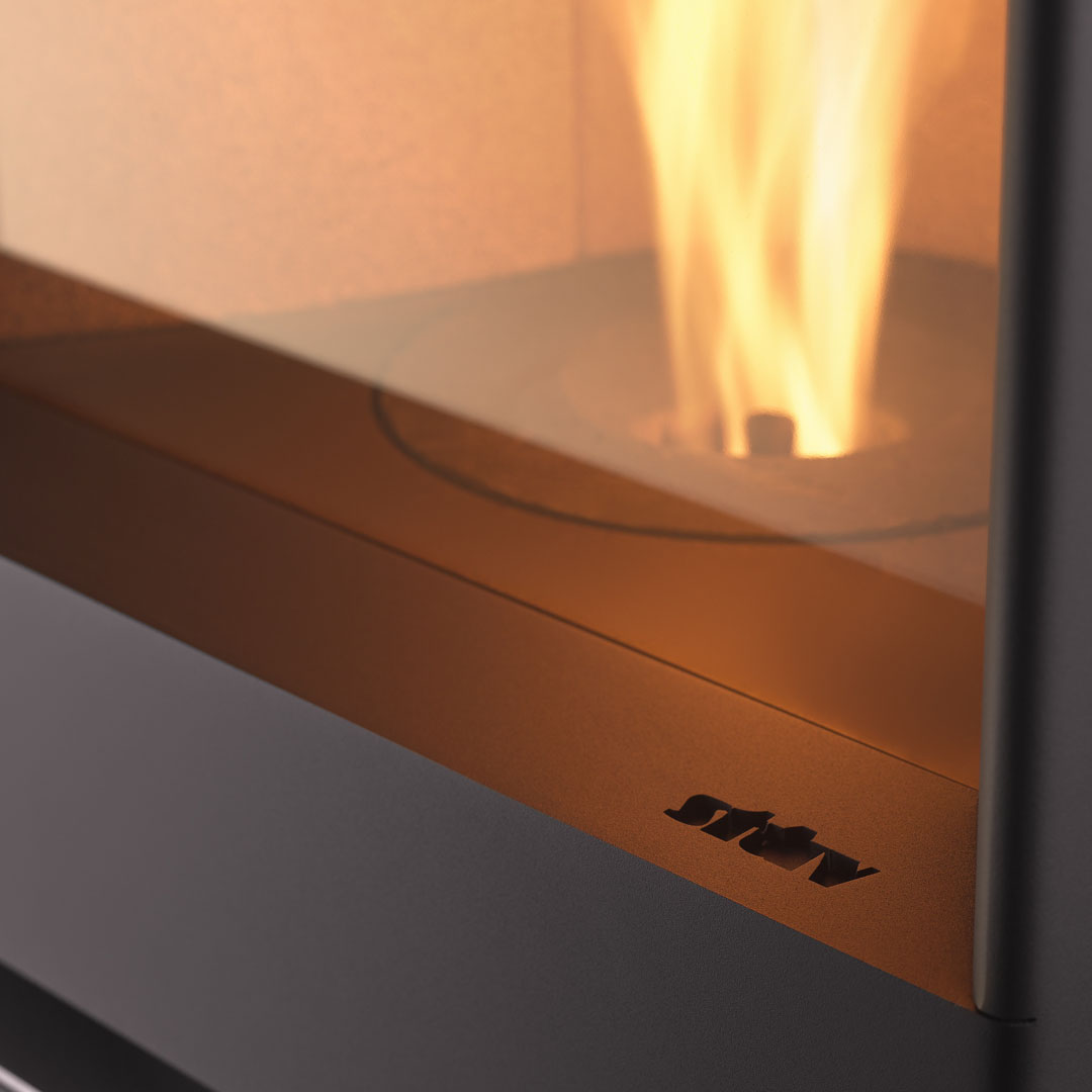 The Stûv sP10 pellet stove combines elegant design with cutting edge technology to deliver quiet, clean, and customisable heating for your home. Its unique two-section design features a visible, radiant fire at the top and a concealed pellet storage and technical area below. Engineered for silent operation, the sP10 uses natural convection and a patented pellet feed system that eliminates clattering noises.