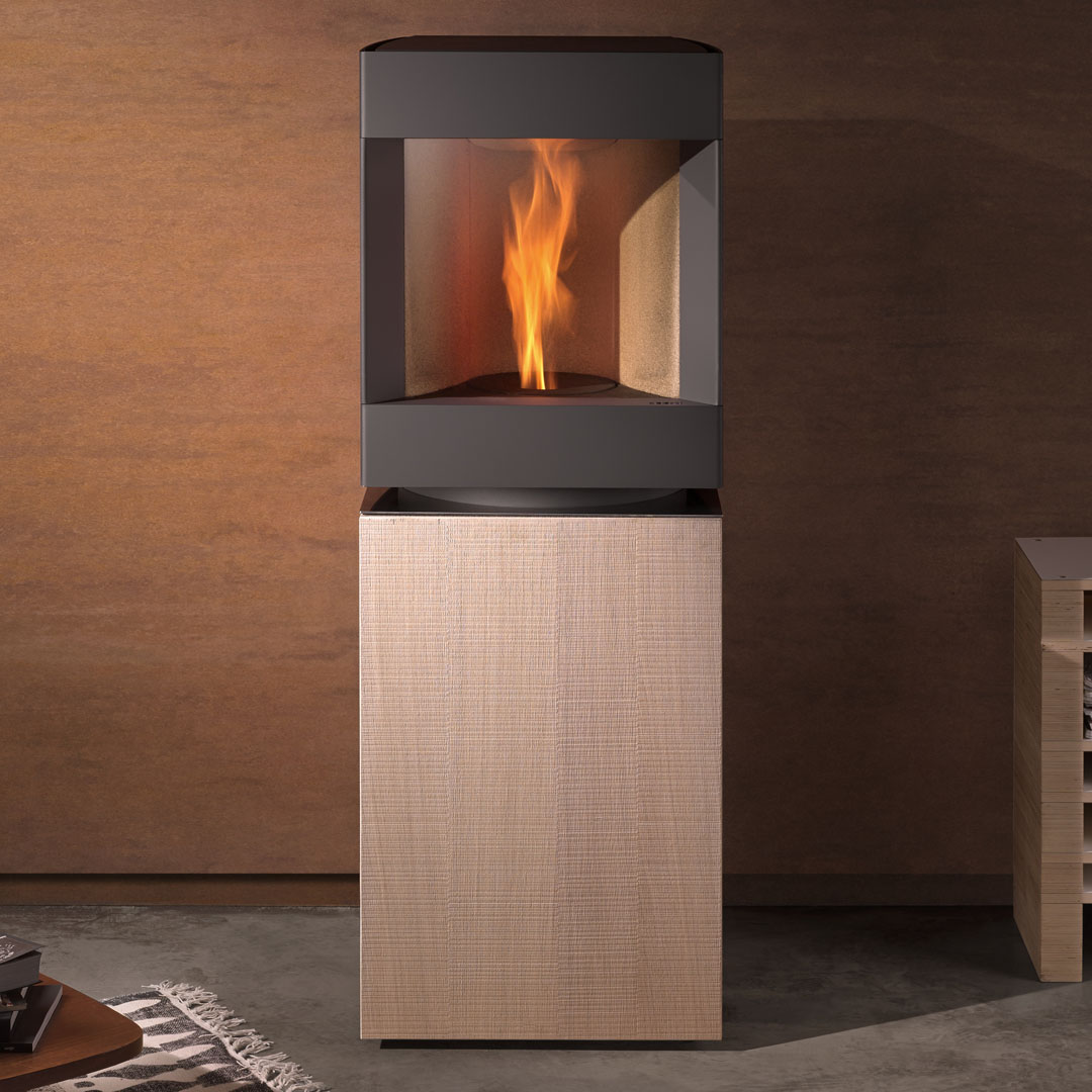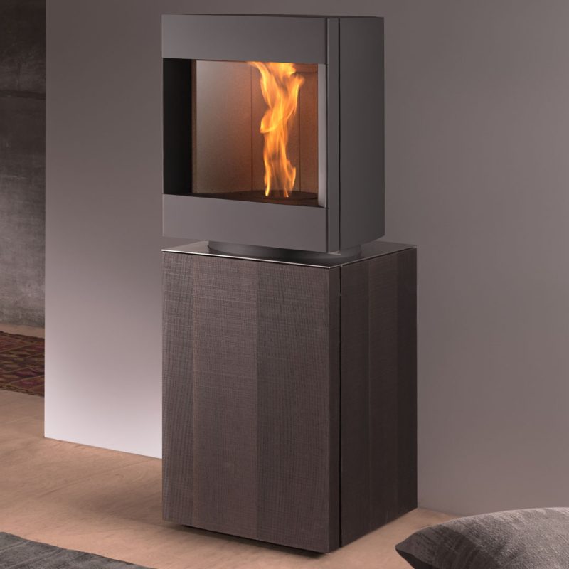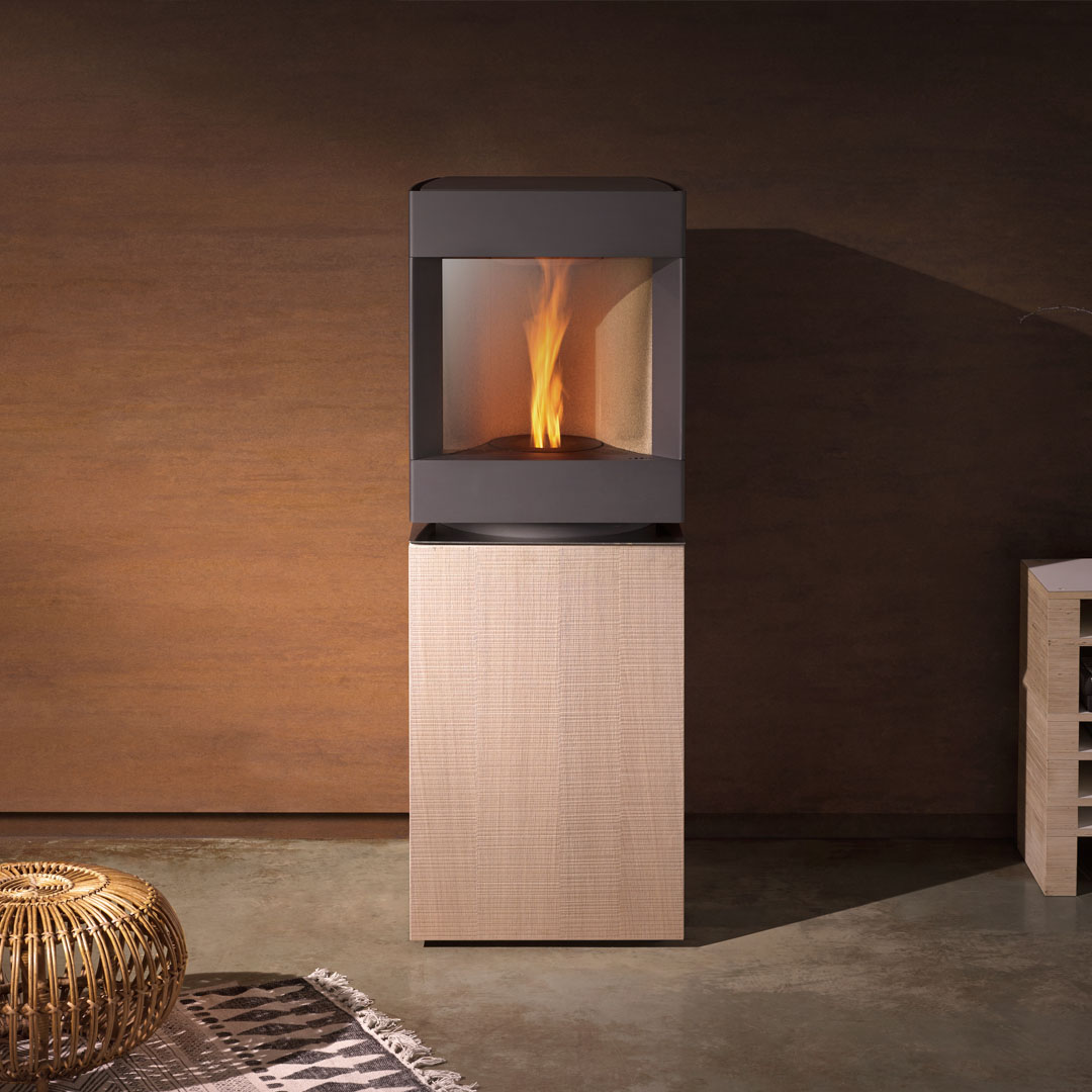 This stove offers flexible customisation with three base finishes such as steel, bleached oak, or dark oak and the option to personalise the cladding with wood, glass, or other materials to perfectly suit your interior style. The top part pivots up to 45° to direct heat where you want it and maximise the stunning flame view.