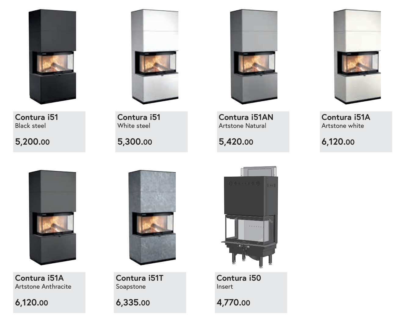 You can either opt for no cladding or colours such as Black Steel, White Steel, Artstone Natural, Artstone White, Artstone Anthracite or Soapstone