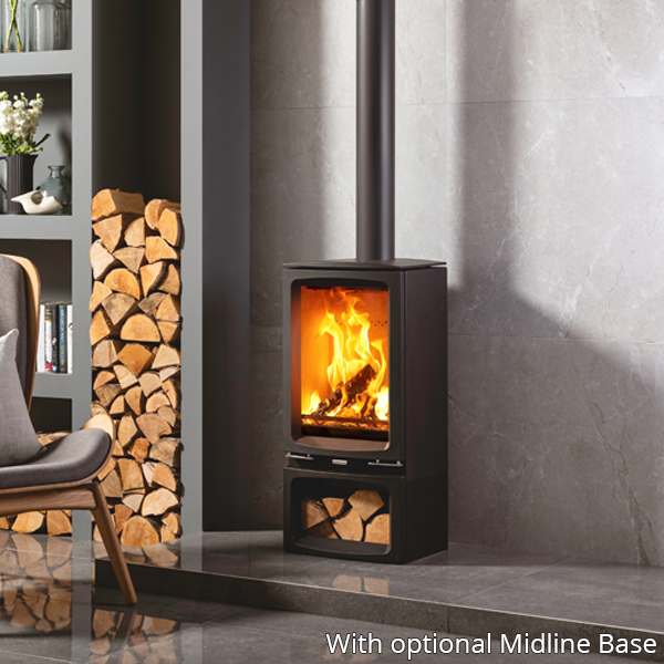 The Stovax Vogue Midi T offers not just superior aesthetics but also practicality. You have the option to install it with the Midline log store base, which not only provides convenient fuel storage but also increases the stove’s height, elevating your interior decor and making a stylish statement.